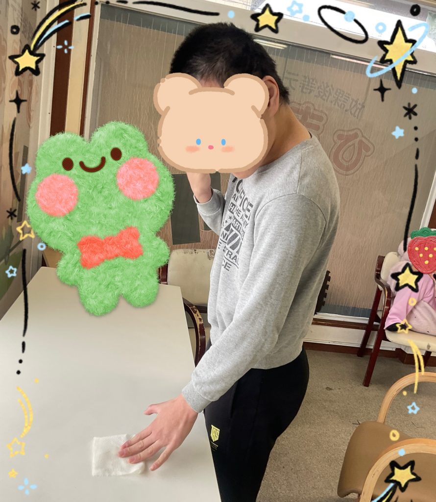 アルコールペーパーをしっかり持ち、端から端まで拭くことで、腕や手首の動きの練習にもなります。「きれいになったよ!」と達成感を感じる姿が見られました。