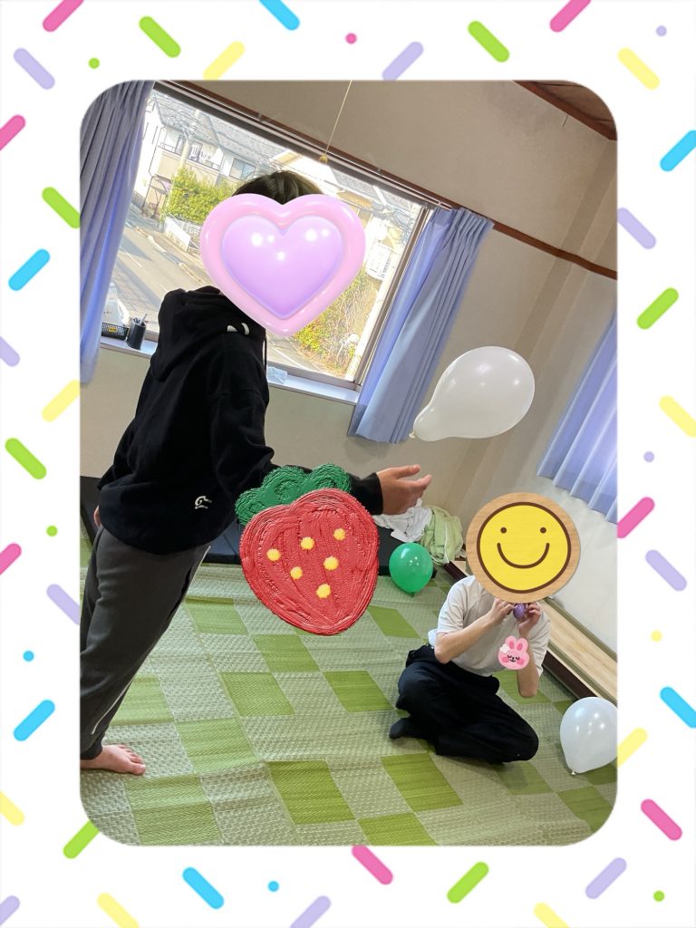 次に風船遊びです。ふわふわと浮く風船を追いかけたり、優しく触れたりしながら、友だちと一緒に楽しく遊ぶことができました🎈