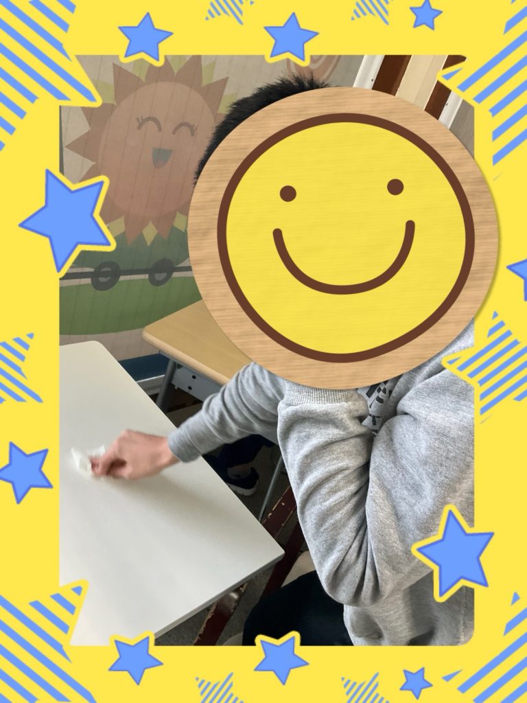 職員と一緒に「きれいにしようね」と声をかけながら、丁寧に机を拭くことができました。準備もばっちりです。