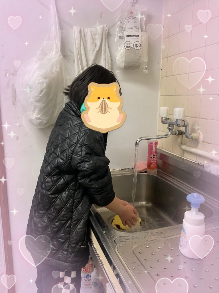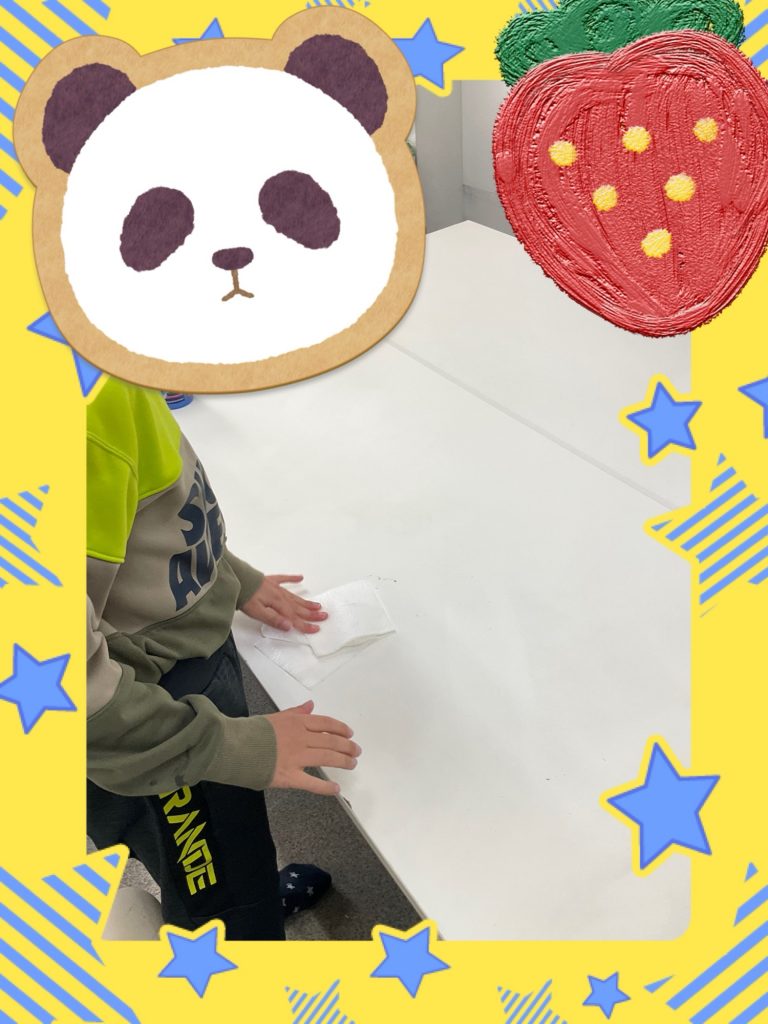 「使った場所はきれいにする」ことを大切にし、布巾を使って机を一生懸命拭く姿が印象的でした。自分たちで環境を整える経験につながっています。